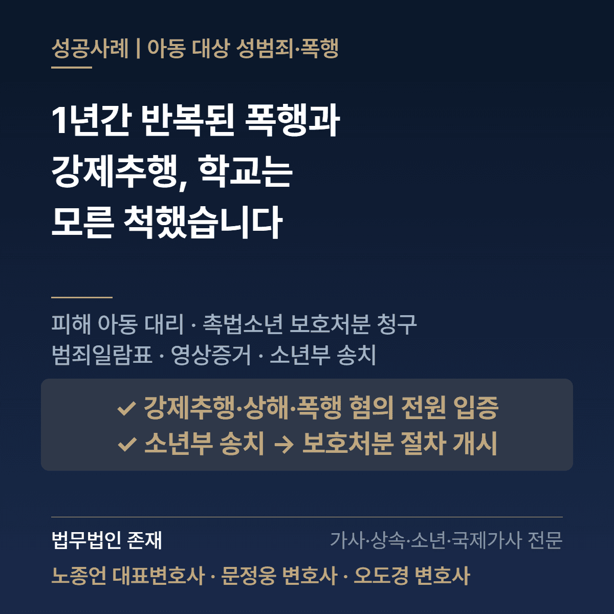 1년간 반복된 폭행과 강제추행, 학교는 모른 척했습니다 — 촉법소년 가해자 전원의 혐의를 입증하고 소년부 송치를 이끌어낸 사례